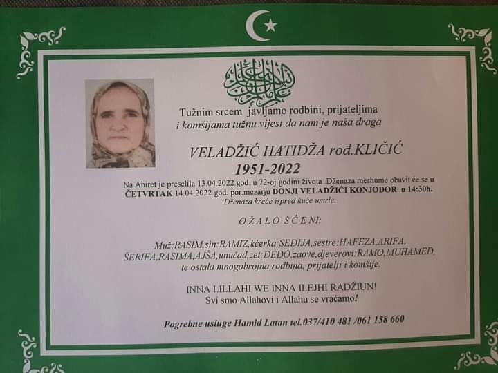Tužnog srca i s bolom u duši obavještavamo rodbinu, komšije i prijatelje da je naša draga Veladžić Hatidža rođ. Kličić, dana 13.04.2022. godine, u 72-oj godini života, preselila na Ahiret.