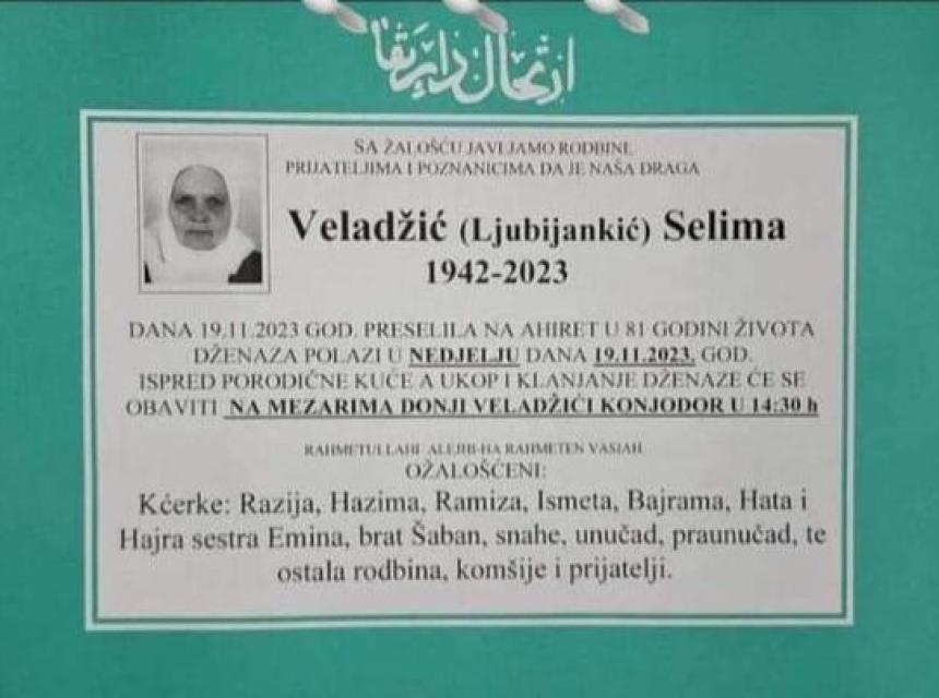 Dana 19.11.2023.godine a Ahiret preselila Veladžić (Ljubijankić) Selima u 81.-oj godini života.
