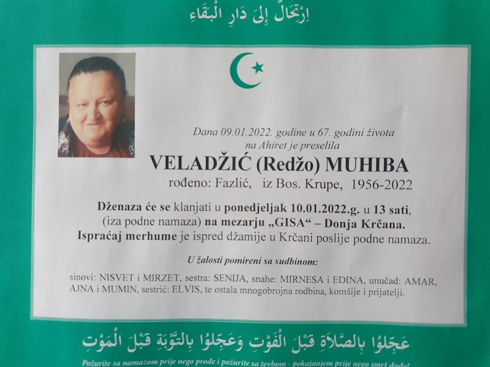 Tužnog srca i s bolom u duši obavještavamo rodbinu, komšije i prijatelje da je naša dragaVeladžić (Redžo) Muhiba dana 09.01.2022. godine, u 67. godini života, preselila na Ahiret.