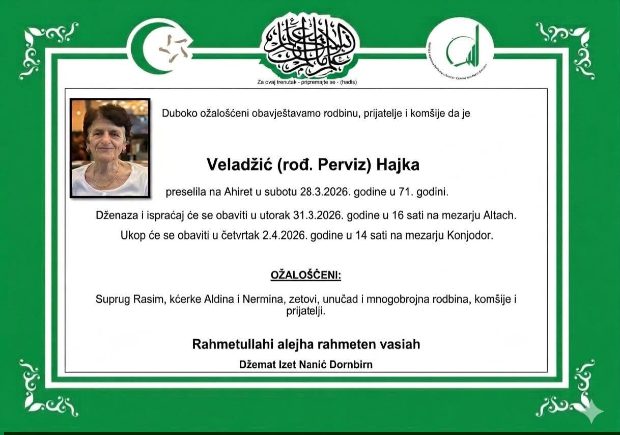 Dženaza i ispraćaj će se obaviti u utorak 31.3.2026. godine u 16 sati na mezarju Altach.