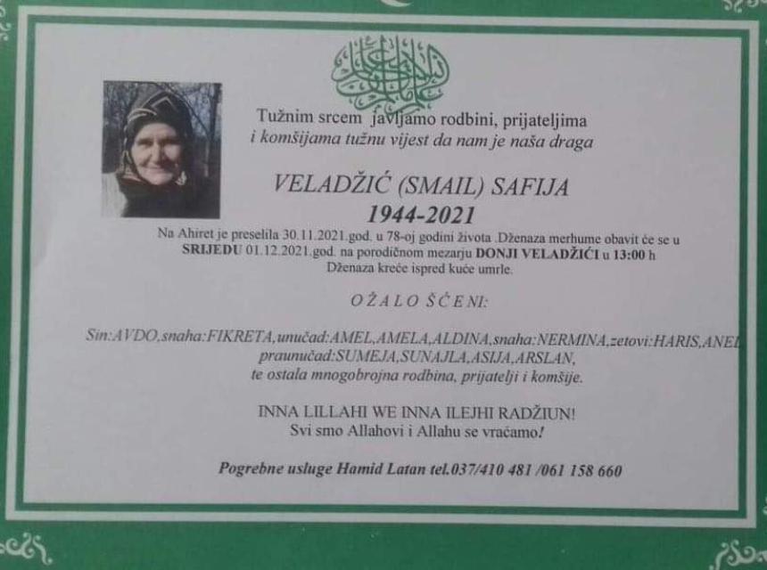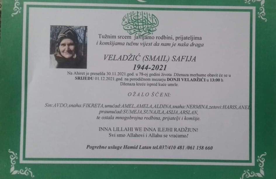 Tužnog srca i s bolom u duši obavještavamo rodbinu, komšije i prijatelje da je naša draga Veladžić (Smail) Safija dana 30.11.2021. u 78. godini života preselila na ahiret.