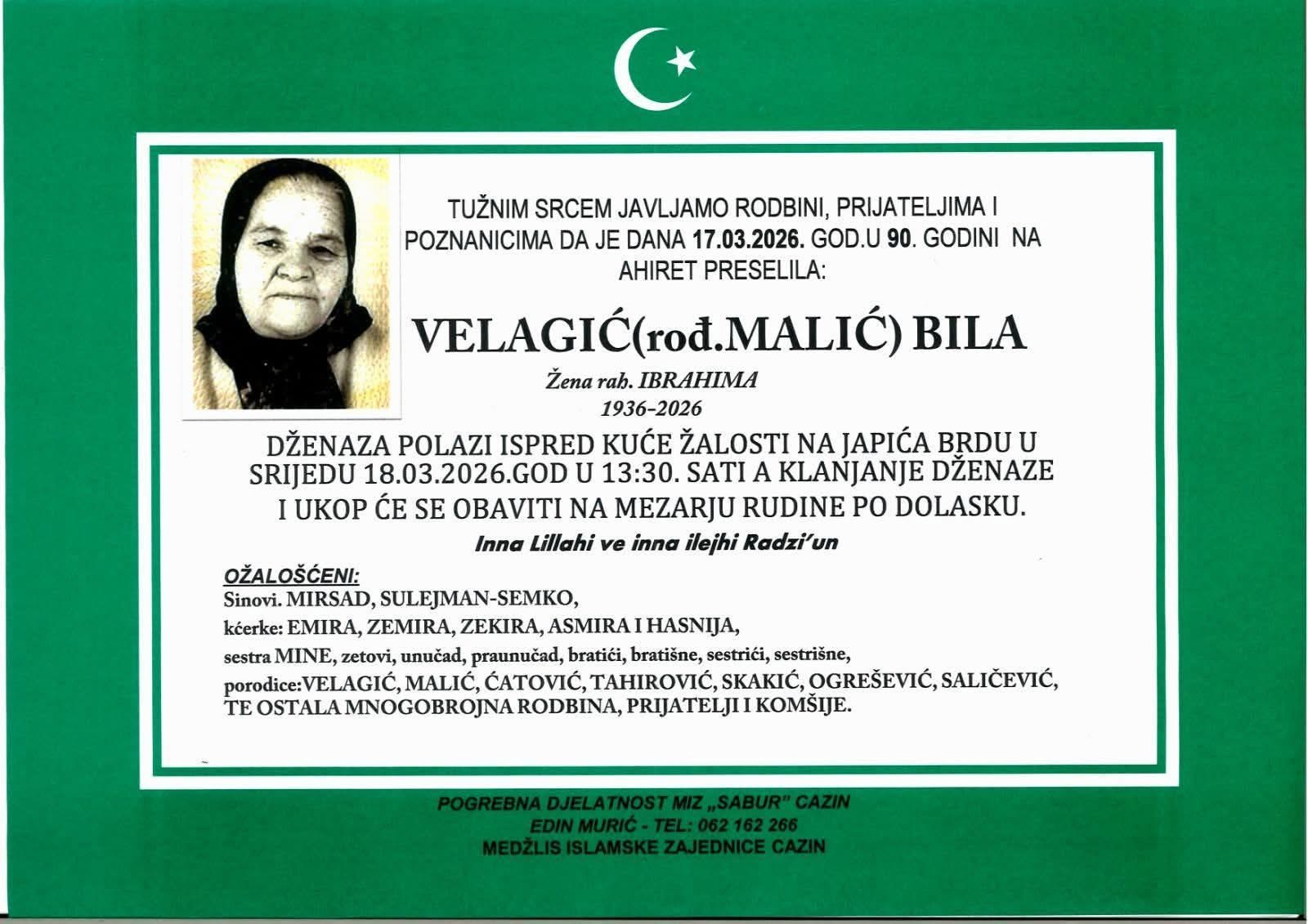 Dženaza polazi ispred kuće žalosti na Japića Brdu u srijedu, 18.03.2026. godine, u 13:30 sati, a klanjanje dženaze i ukop će se obaviti na mezarju Rudine po dolasku.