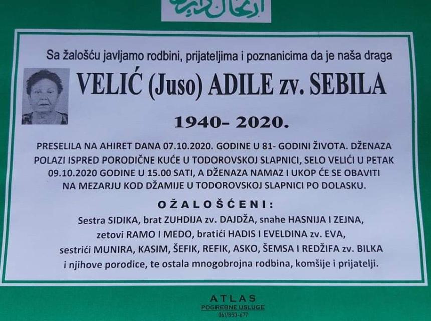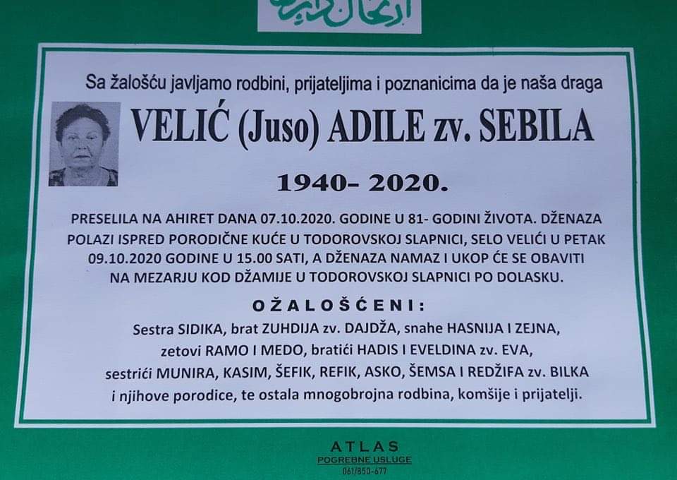 Tužnog srca i s bolom u duši obavještavamo rodbinu, komšije i prijatelje da je naša draga Velić (Juso) Adile zv. Sebila, dana 07.10.2020. godine, u 81-oj. godini života, preselila na Ahiret.