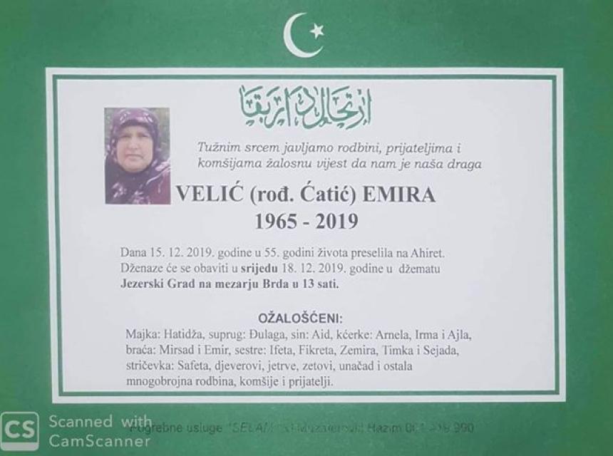 Tužnim srcem i bolom u duši javljamo rodbini, prijateljima, komšijama i poznanicima da je 15.12.2019. godine u 55-toj godini života na Ahiret preselila Velić (rođ. Ćatić) Emira.