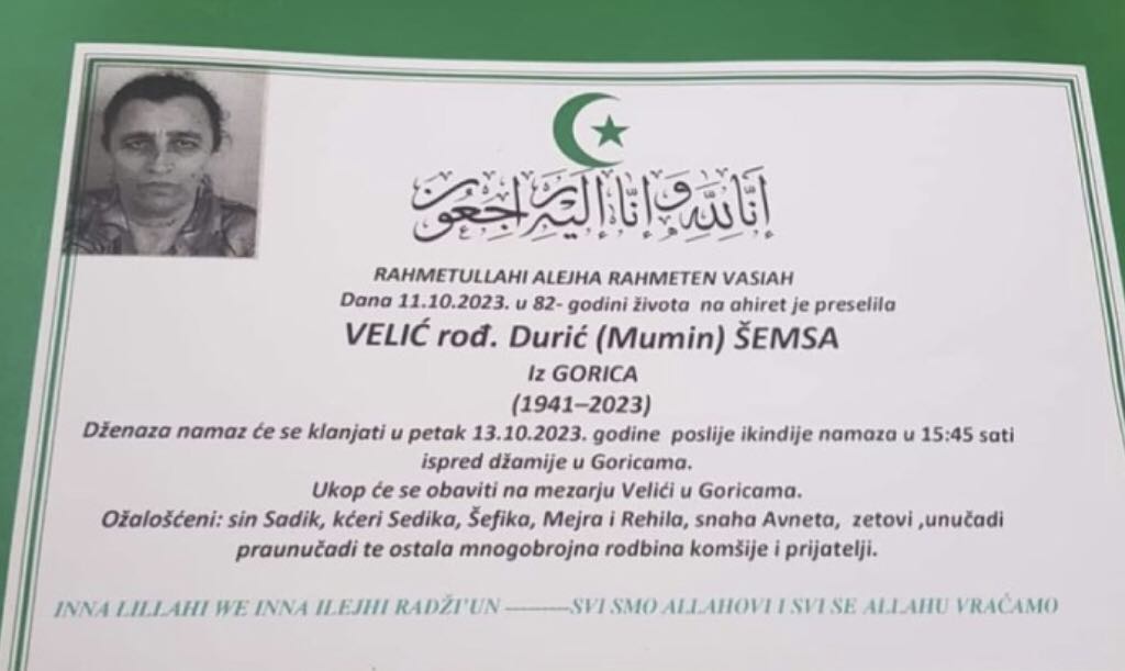 Dženaza namaz će se klanjati u petak 13.10.2023. godine poslije ikindije namaza u 15:45 sati ispred džamije u Goricama