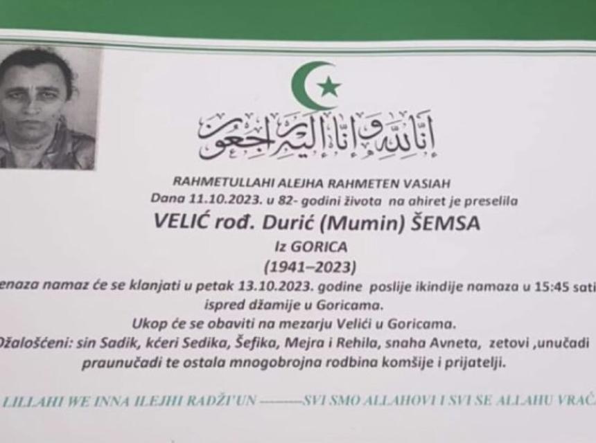 Tužnim srcem javljamo rodbini, prijateljima i komsijama žalosnu vijest da nam je naša draga Velić rođ. Durić (Mumin) Šemsa dana 11.10. 2023. godine u 82. godini života preselila na ahiret.