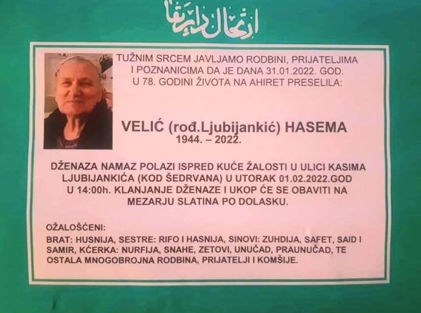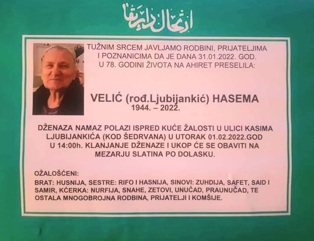 Tužnog srca i s bolom u duši obavještavamo rodbinu, komšije i prijatelje da je naša draga Velić (rođ. Ljubijankić) Hasema, dana 31.01.2022. godine, u 78-oj godini života, preselila na Ahiret.