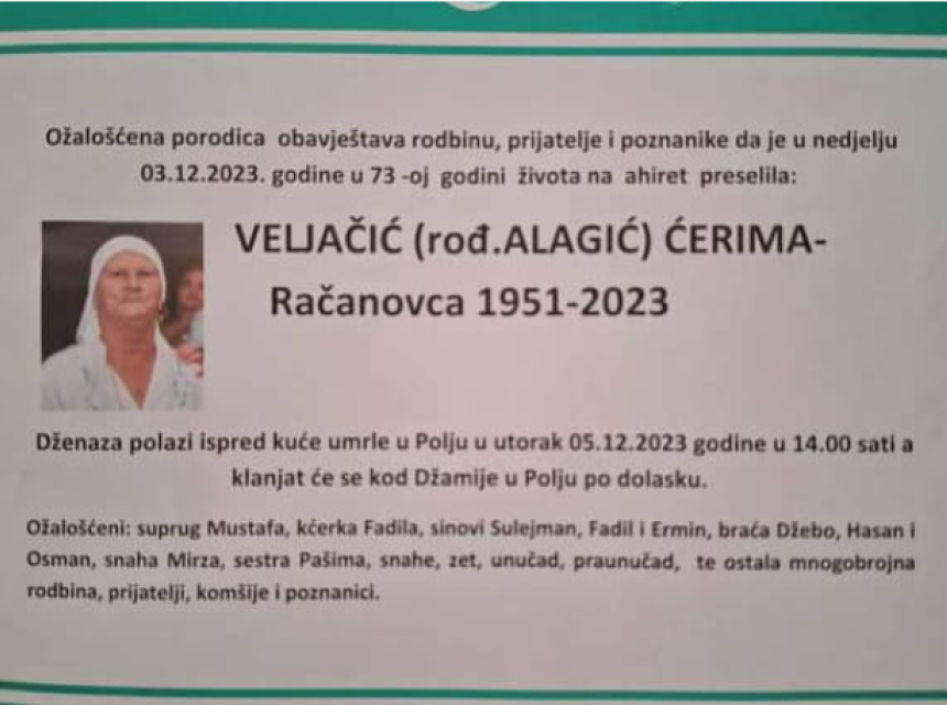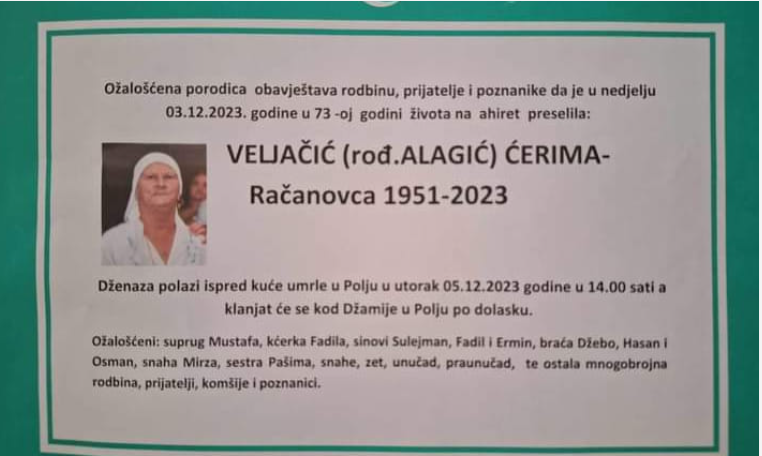 Ožalošćena porodica obavještava rodbinu, prijatelje i poznanike da je u nedjelju 03.12.2023. godine u 73-oj godini života na Ahiret preselila VELJAČIĆ (rođ.ALAGIĆ) ČERIMA- Račanovca.