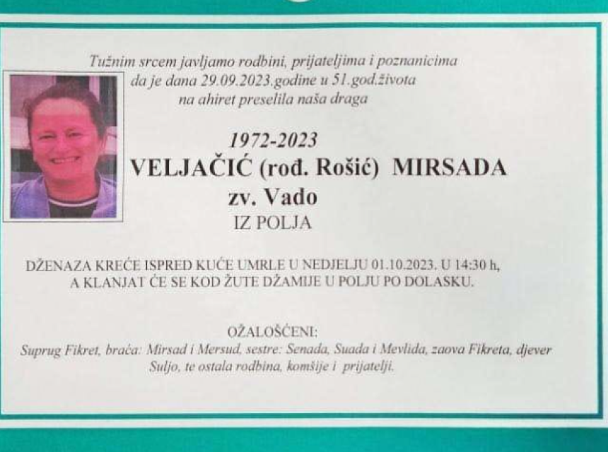 Tužnim srcem javljamo rodbini, prijateljima i poznanicima da je dana 29.09.2023.godine u 51.god.života na ahiret preselila naša draga VELJAČIĆ (rod. Rošić) MIRSADA ZV. Vado IZ POLJA.