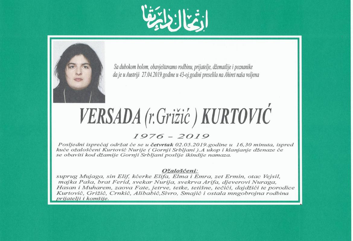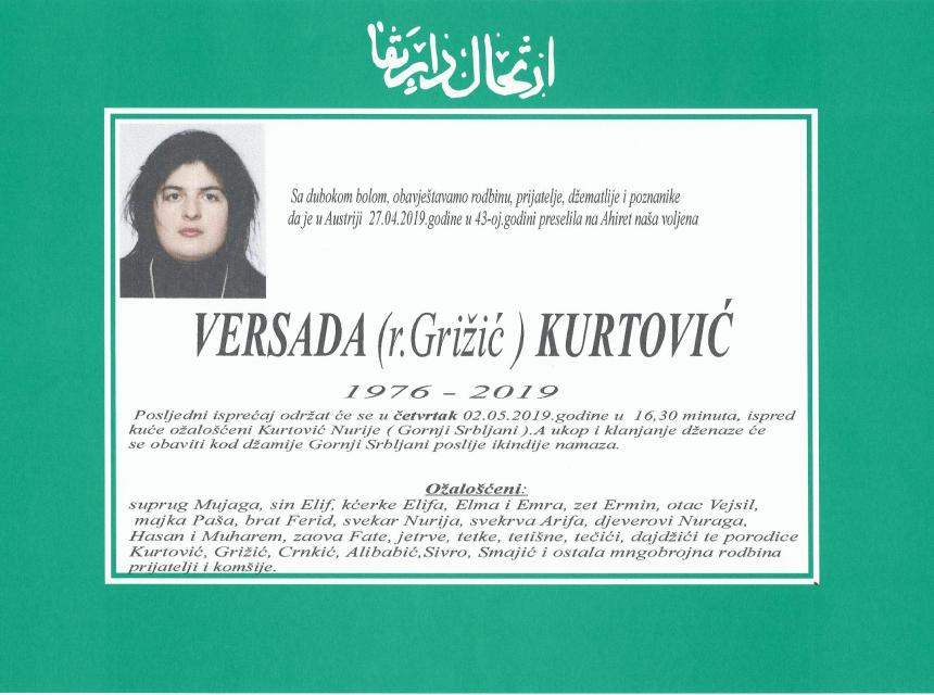 Javljamo rodbini, prijateljima, komšijama i poznanicima da je u Austriji dana 27.04.2019.godine u 43.- oj godini života na Ahiret preselila Versada (rođ. Grižić) Kurtović.