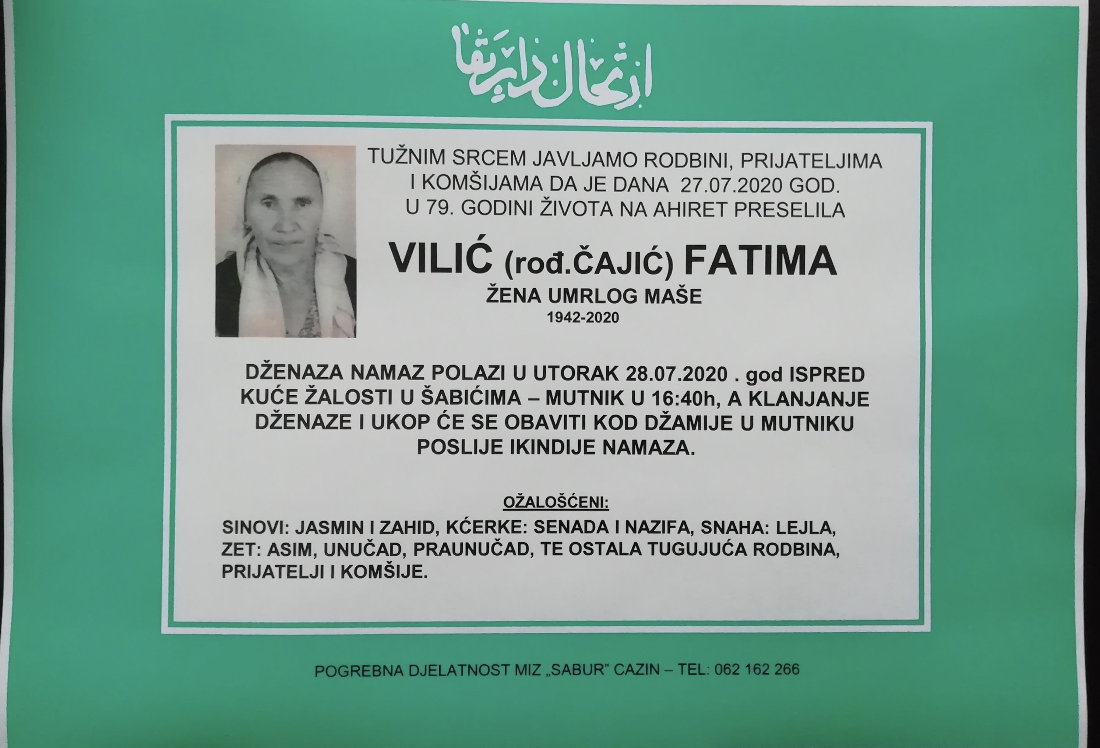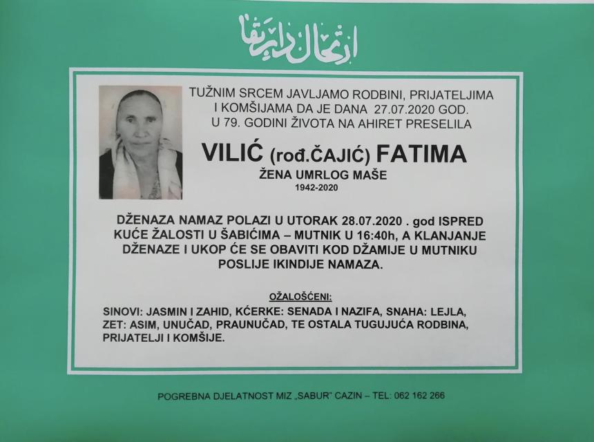 Tužnog srca i s bolom u duši obavještavamo rodbinu, komšije i prijatelje da je naša draga Vilić (Čajić) Fatima 27. jula 2020. godine, u 79-oj godini života, preselila na Ahiret.