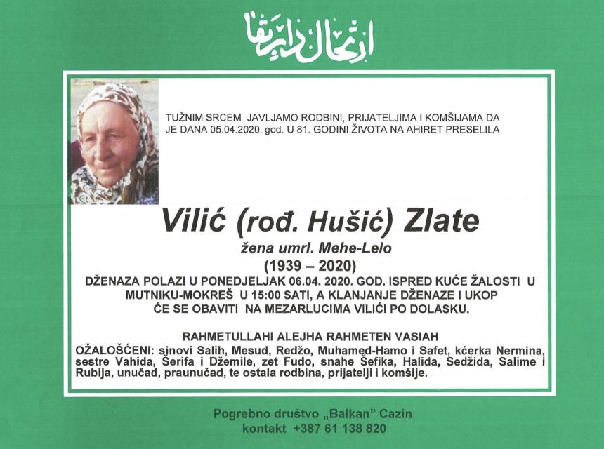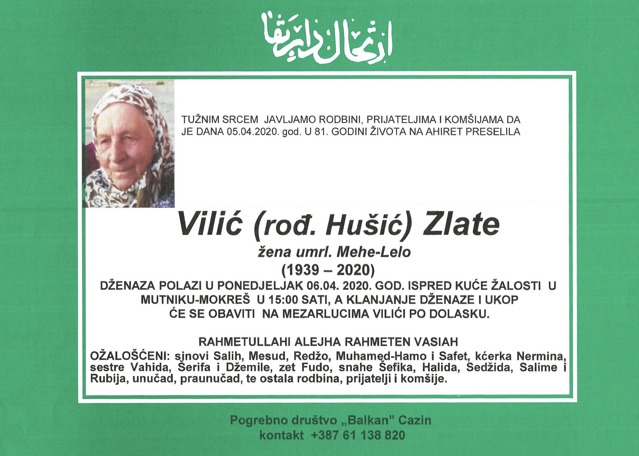 Tužnim srcem i bolom u duši javljamo rodbini i prijateljima da je naša draga i nikad prežaljena Vilić (Hušić) Zlate žena umrl. Mehe-Lelo dana 05.04.2020. godine u 81-oj godini života preselila na Ahiret.