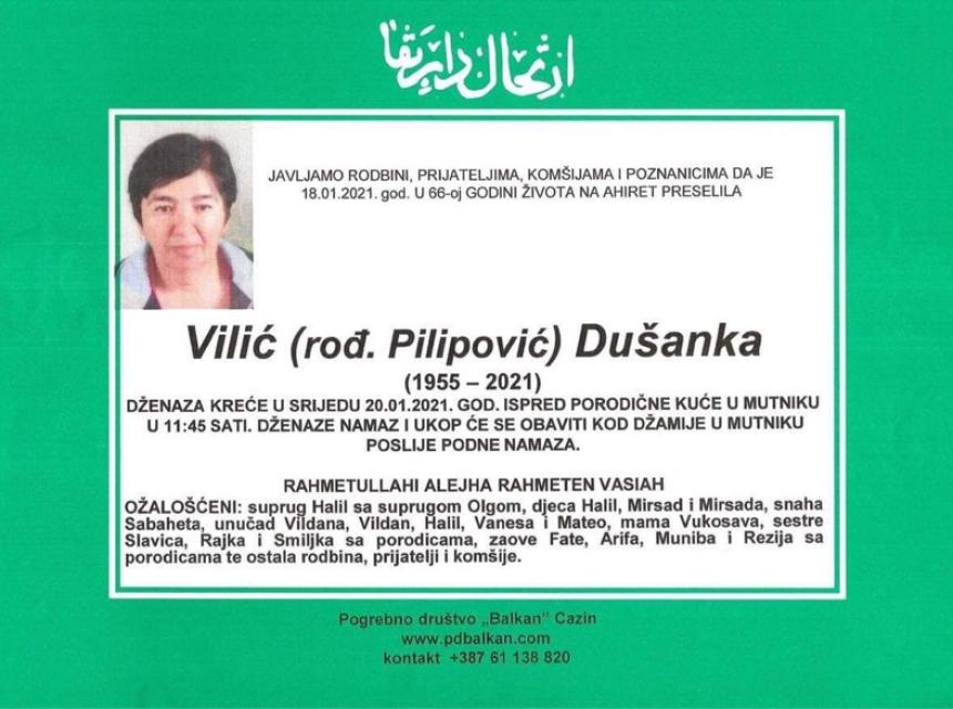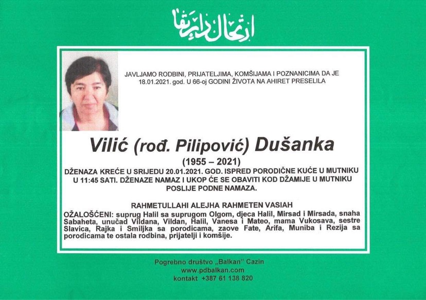 Tužnog srca i s bolom u duši obavještavamo rodbinu, komšije i prijatelje da je naša draga Vilić (rođ. Pilipović) Dušanka, dana 18.1.2021. godine, u 66.-oj godini života, preselila na Ahiret.