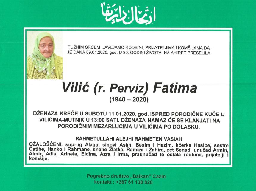Duboko ožalošćeni obavještavamo rodbinu, prijatelje i komšije da je naša draga Vilić (rođ. Perviz) Fatima preselila na Ahiret dana 9.1.2020.u 80.godini života.