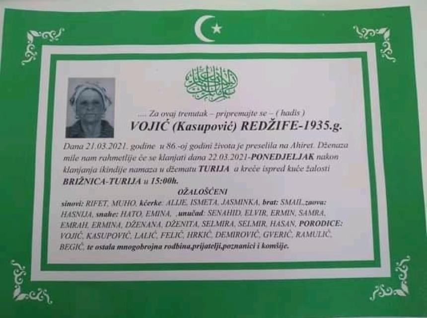 Tužnog srca i s bolom u duši obavještavamo rodbinu, komšije i prijatelje da je naša draga Vojić (Kasupović) Redžife, dana 21.03.2021 godine, u 86-oj godini života, preselila na Ahiret.