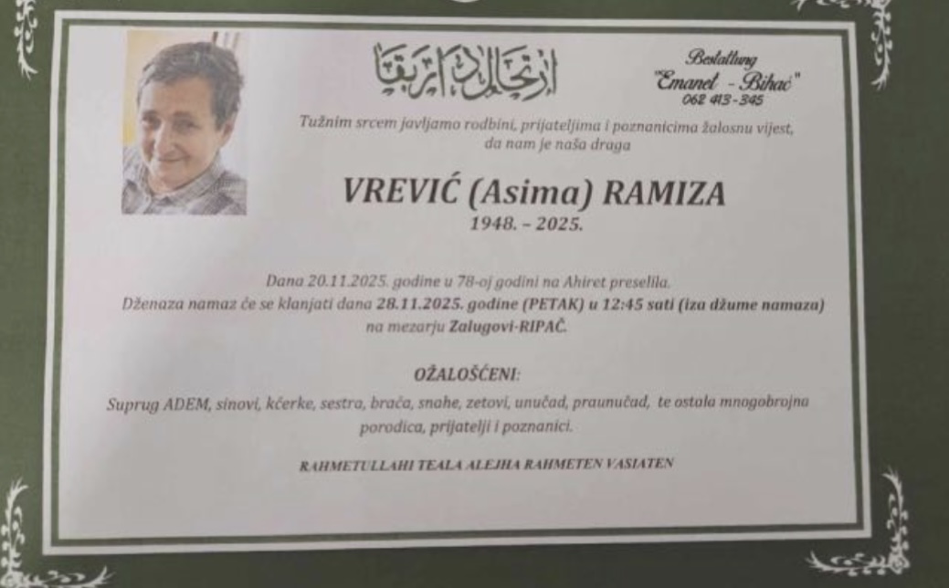 Dženaza namaz će se klanjati dana 28.11.2025. godine (PETAK) u 12:45 sati (iza džume namaza) na mezarju Zalugovi–RIPAČ.