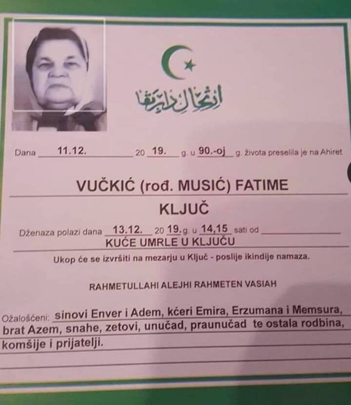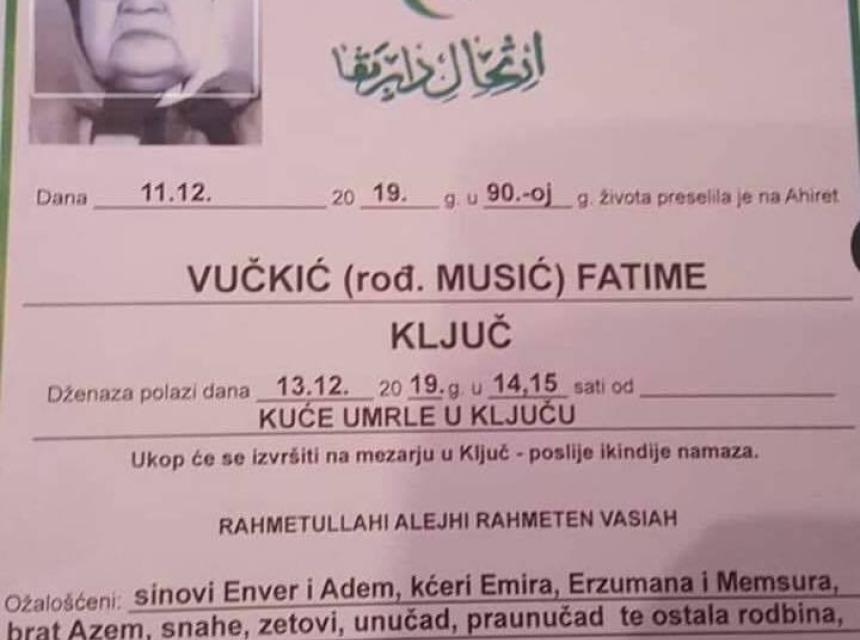 Dženaza polazi dana 13.12.2019. godine, u 14:15 h, od kuće umrle u KLJUČU. Ukop će se izvršiti na mezarju u KLJUČU, nakon ikindije namaza.
