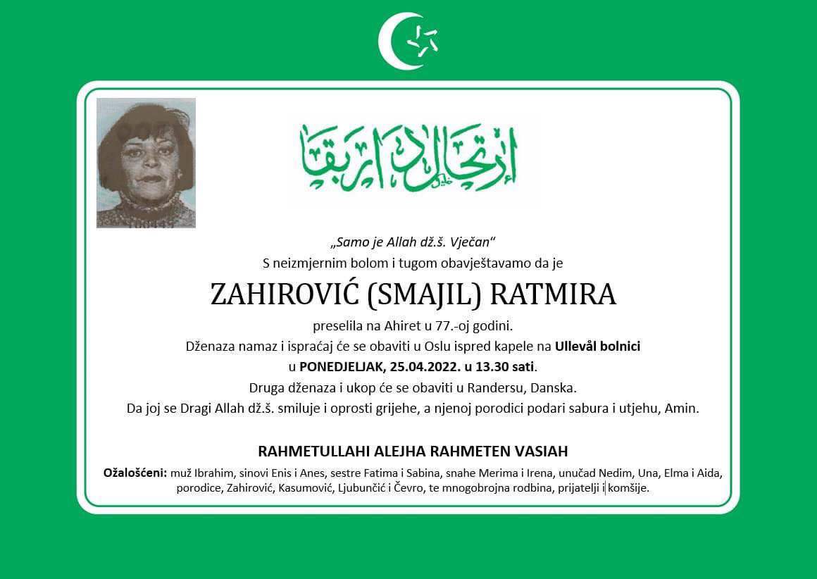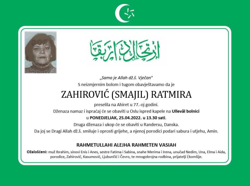 Tužnog srca i s bolom u duši obavještavamo rodbinu, komšije i prijatelje da je naša draga Zahirović (Smajil) Ratmira, u 77-oj godini života, preselila na Ahiret.