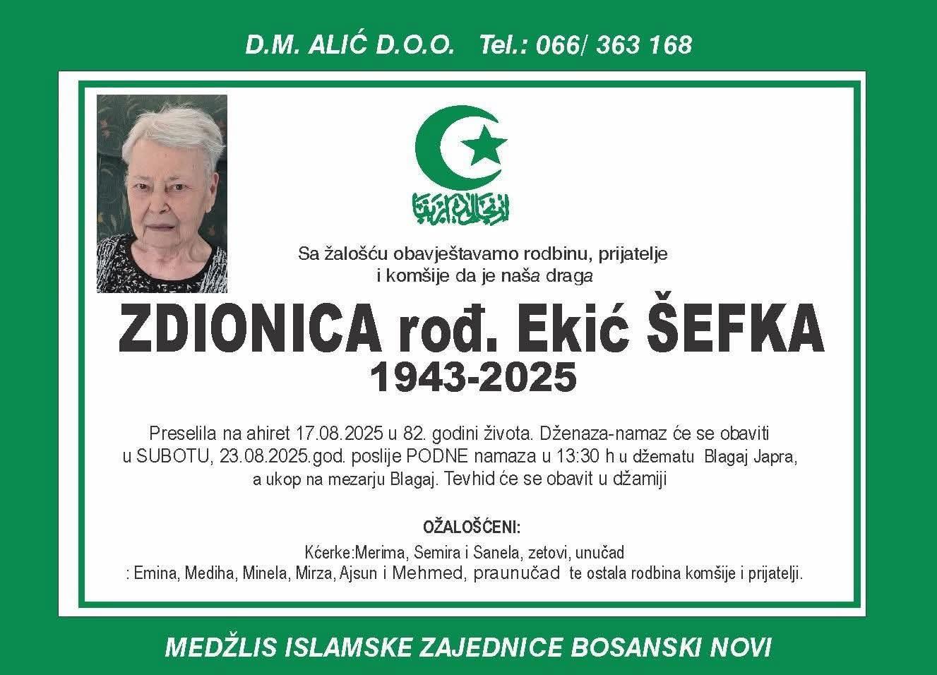 Sa žalošću obavještavamo rodbinu, prijatelje i komšije da je naša draga ZDIONICA rođ. Ekić ŠEFKA preselila na ahiret 17.08.2025. u 82. godini života.