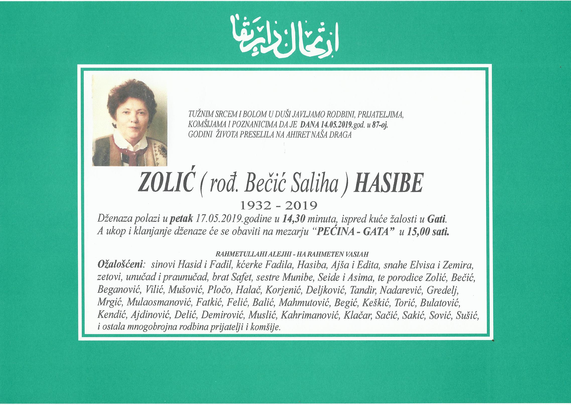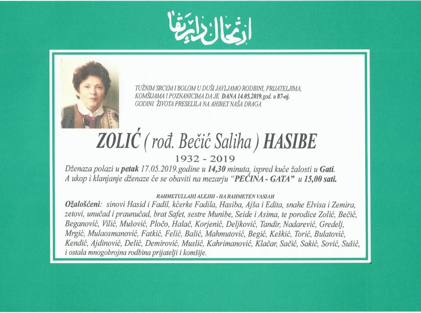 Tužnim srcem i bolom u duši javljamo rodbini, prijateljima, komšijama i poznanicima da je dana 14.05.2019. god. u 87-oj. godini života preselila na ahiret naša draga Zolić (rođ. Bečić Saliha) Hasibe.