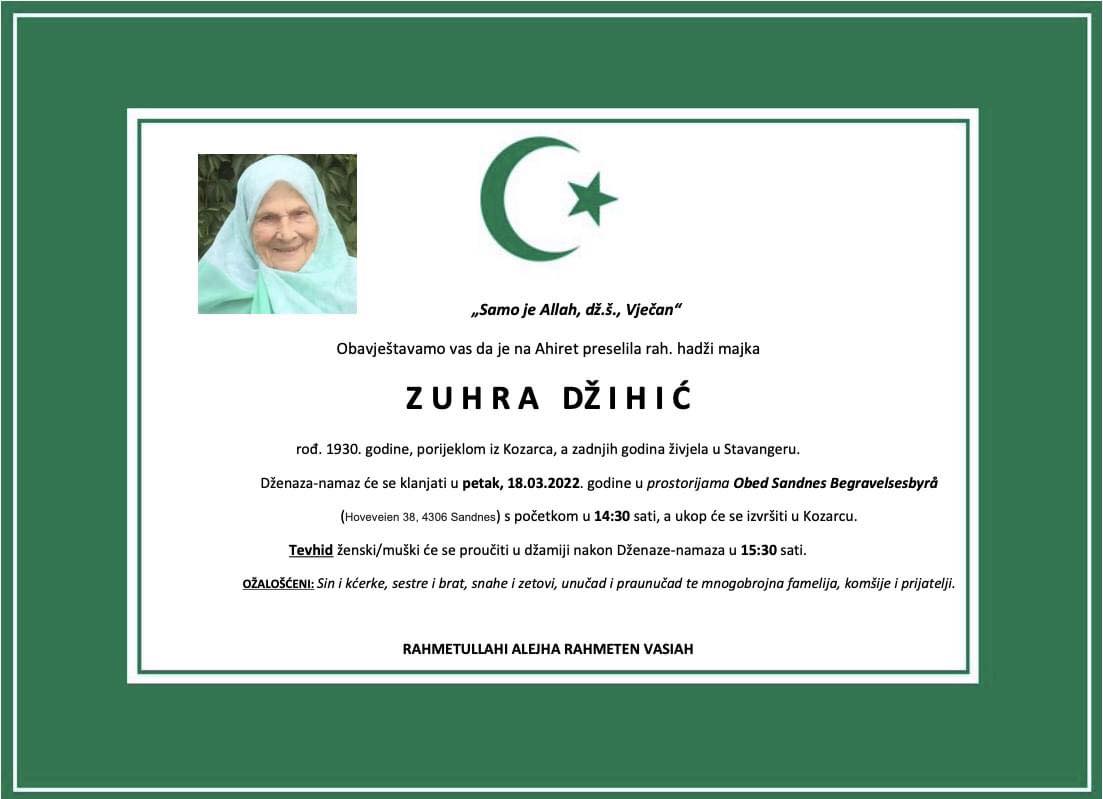 Tužnog srca i s bolom u duši obavještavamo rodbinu, komšije i prijatelje da je naša draga Zuhra Džihić, preselila na Ahiret.