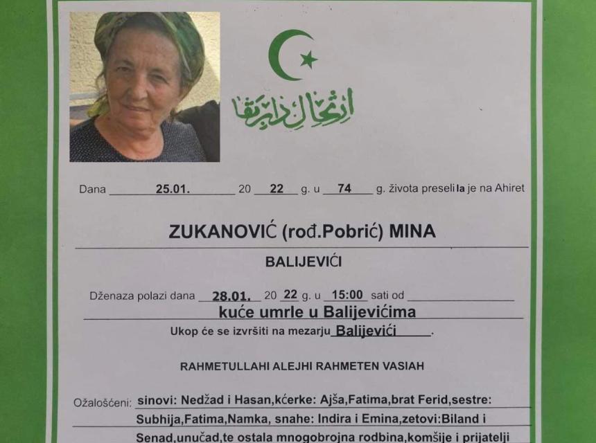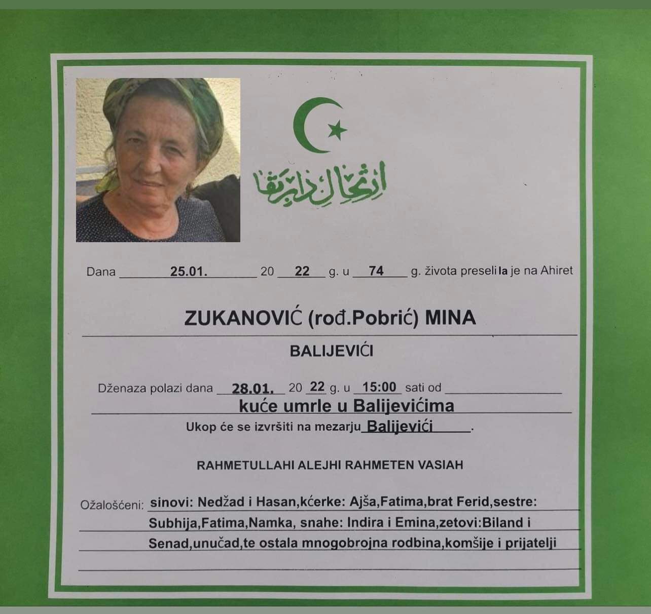Tužnog srca i s bolom u duši obavještavamo rodbinu, komšije i prijatelje da je naša dragq Zukanović (rođ. Pobrić) Mina 25.1.2022. u 74. godini života preselila na ahiret.