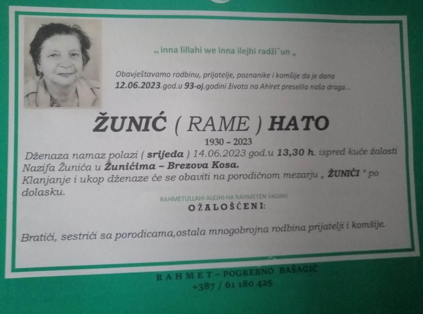 Ožalošćena porodica obavještava rodbinu, prijatelje i poznanike da je 12.06.2023. godine u 93-oj godini zivota na Ahiret preselila Žunić ( Rame) Hato.