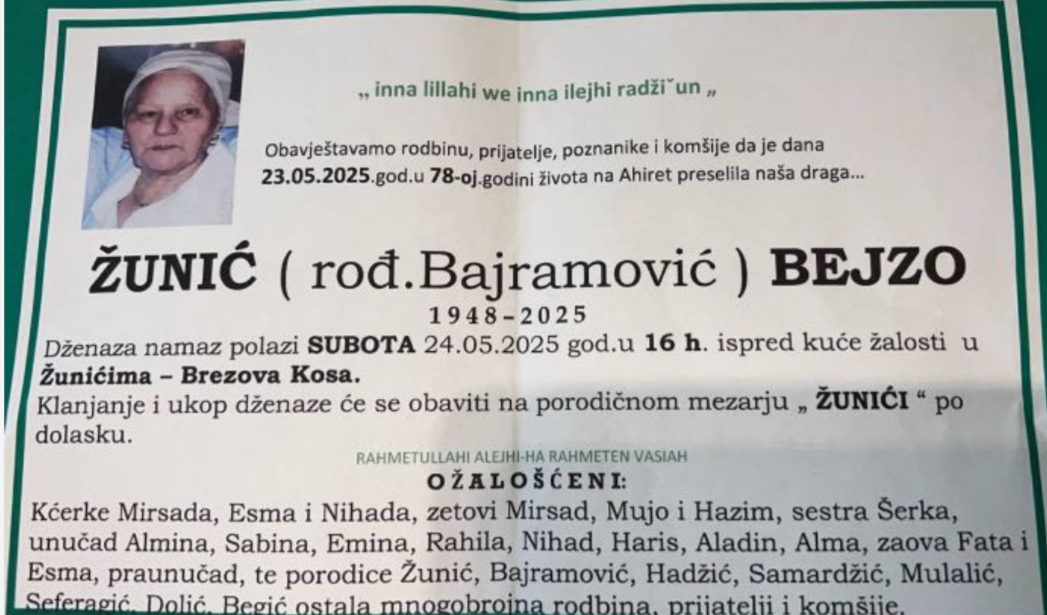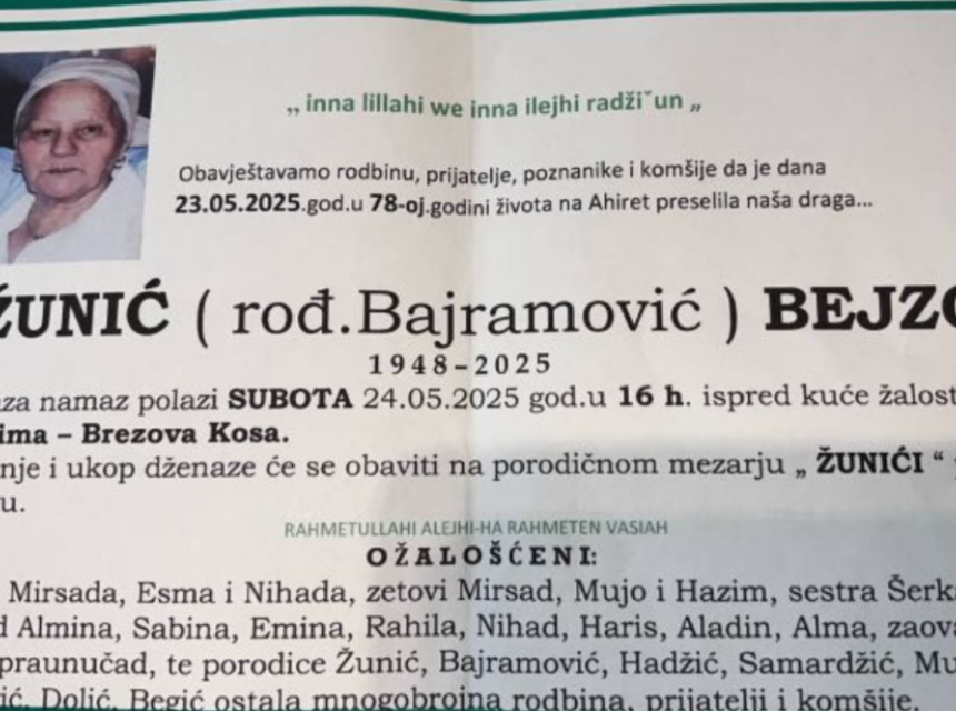 Dženaza polazi ispred kuće umrle u Žunićima u subotu 24.05.2025. godine u 16 sati, a klanjat će se na porodičnom mezarju Žunići po dolasku.
