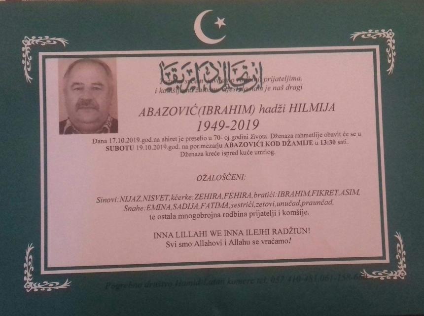 Tužnim srcem javljamo rodbini, prijateljima i komšijama da je naš dragi Abazović (Ibrahim) hadži Hilmija, dana 17.10.2019. godine u 70-oj godini života, preselio na Ahiret.