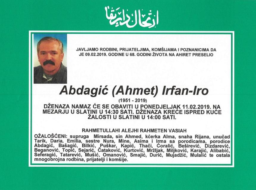 Javljamo rodbini, prijateljima, komšijama i poznanicima da je dana 09.02.2019.g. u 68.-oj godini života na Ahiret preselio Abdagić (Ahmet) Irfan - Iro.