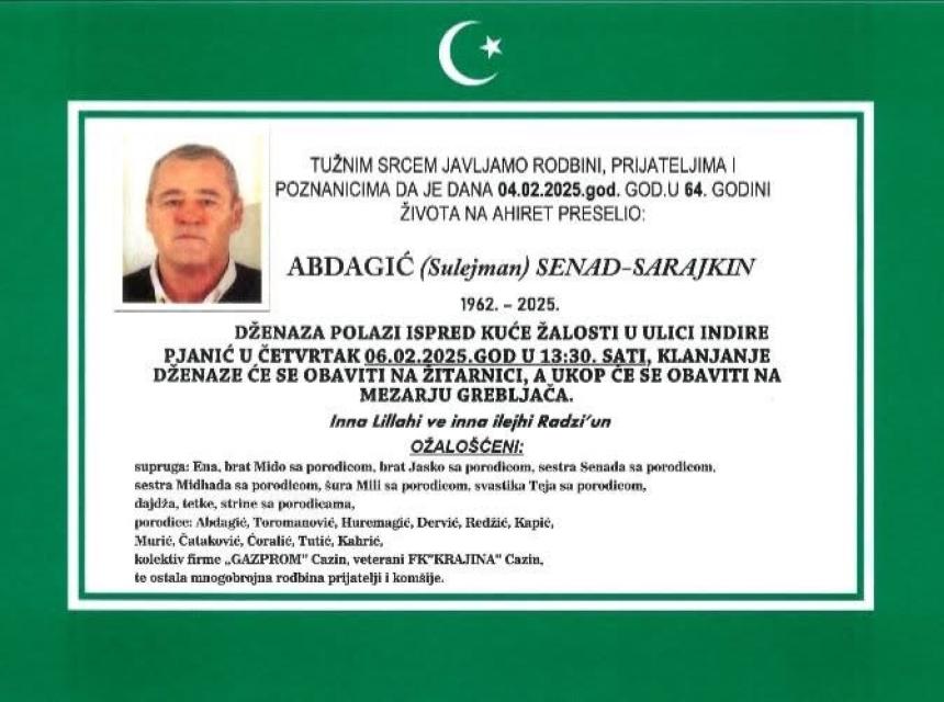 Duboko ožalošćeni obavještavamo rodbinu, prijatelje i komšije da je dana 04.02.2025. god. u 64-oj godini života na ahiret preselio ABDAGIĆ (Sulejman) SENAD - SARAJKIN.