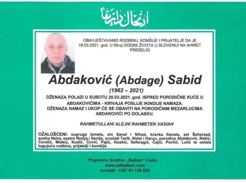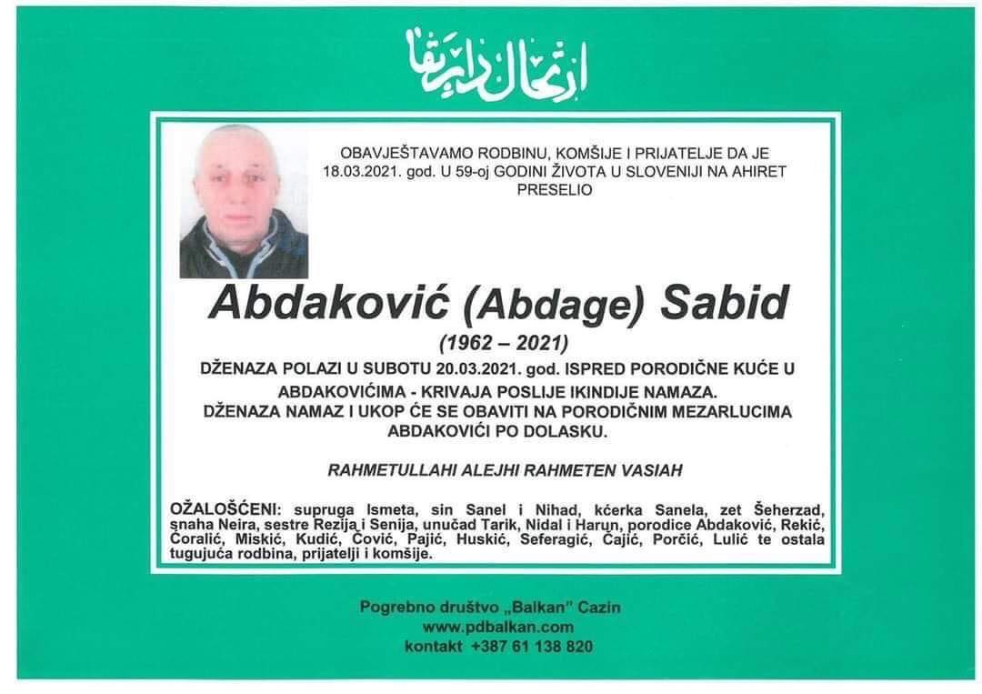 Tužnog srca i s bolom u duši obavještavamo rodbinu, komšije i prijatelje da je naš dragi Abdaković (Abdage) Sabid, 18.03.2021. godine, u 59. godini života preselio na Ahiret.