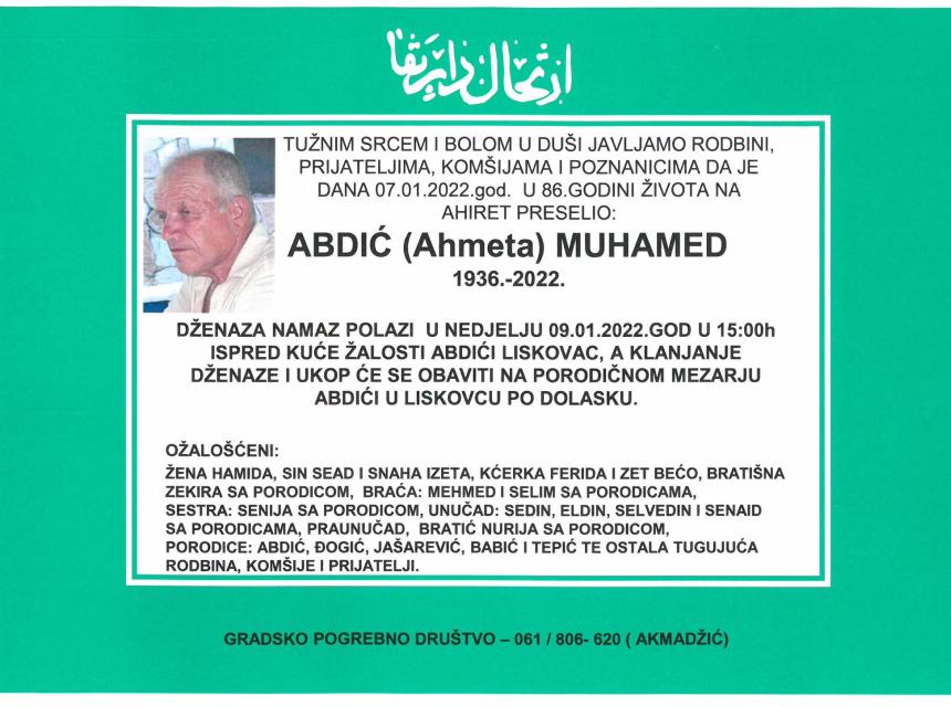 Tužnog srca i s bolom u duši obavještavamo rodbinu, komšije i prijatelje da je naš dragi Abdić (Ahmeta) Muhamed, dana 06.01.2021. godine, u 86-oj godini života, preselio na Ahiret.