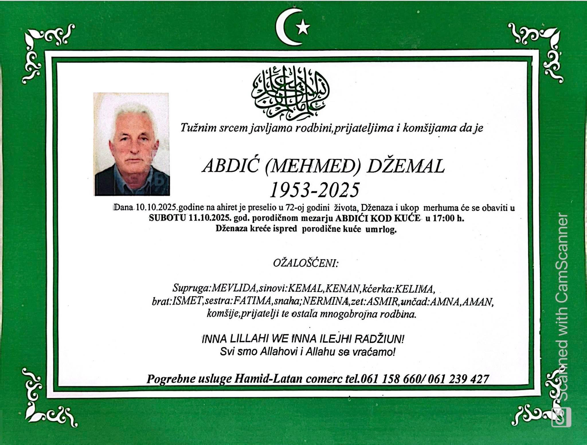 Dana 10.10.2025. godine na ahiret je preselio u 72-oj godini života. Dženaza i ukop merhuma će se obaviti u SUBOTU 11.10.2025. god. porodičnom mezarju ABDIĆI KOD KUĆE u 17:00 h.