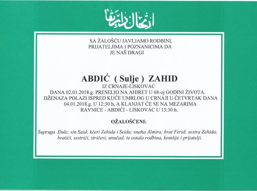 Sa žalošću javljamo rodbini, prijateljima i poznanicima da je Abdić (Sulje) Zahid iz Crnaje- Liskovac, dana 02.01.2018. godine preselio na Ahiret u 68-oj godini života.