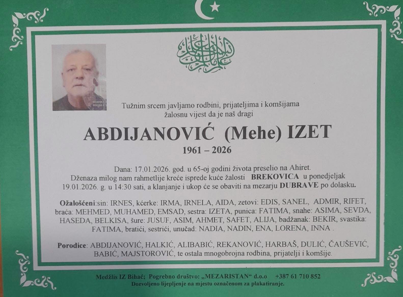 Dženaza milog nam rahmetlije kreće ispred kuće žalosti BREKOVICA u ponedjeljak 19.01.2026. godine u 14:30 sati, a klanjanje i ukop će se obaviti na mezarju DUBRAVE po dolasku.