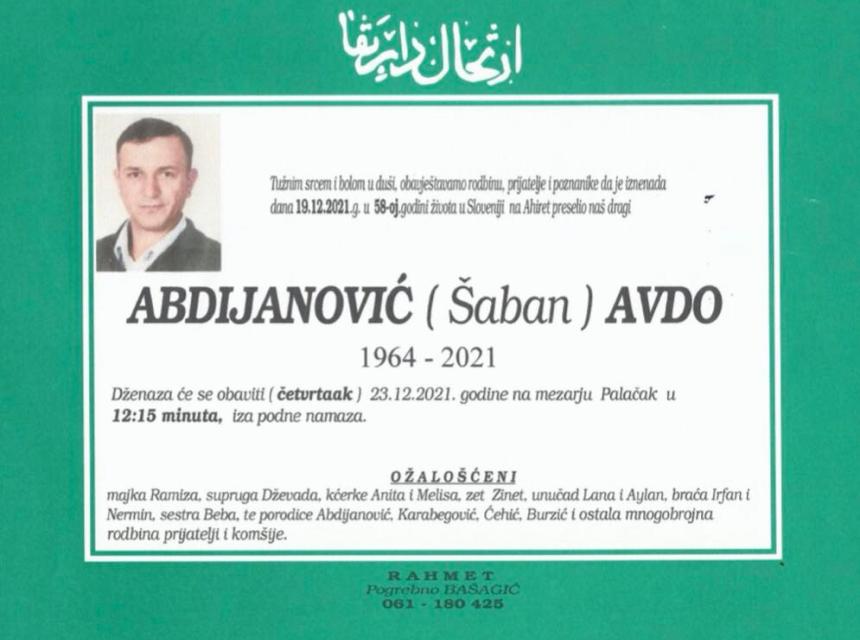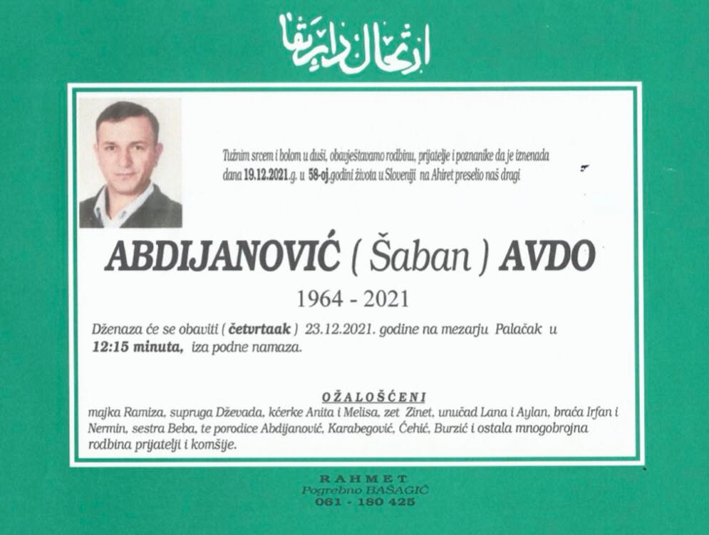 Tužnog srca i s bolom u duši obavještavamo rodbinu, komšije i prijatelje da je naš dragi Abdijanović (Šaban) Avdo dana 19.12.2021. u 58. godini života u Sloveniji preselio na Ahiret.