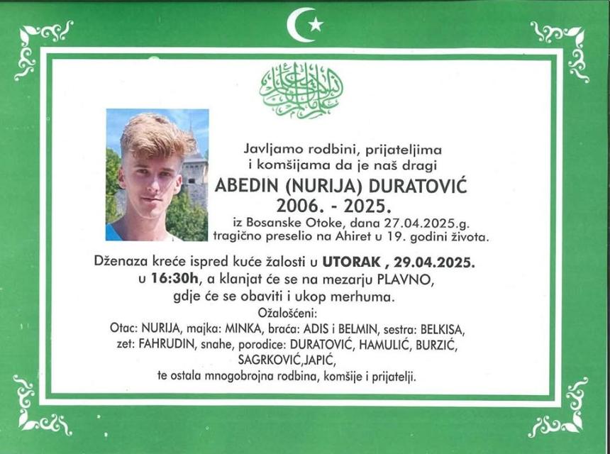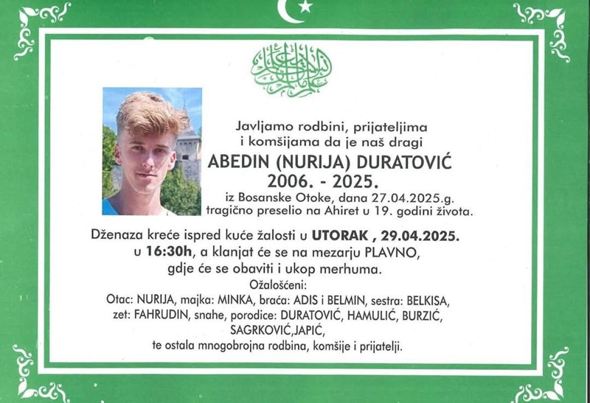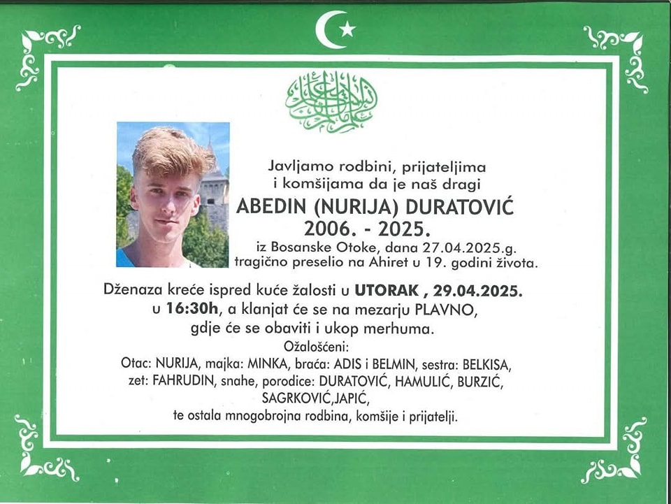 Obavještavamo rodbinu, prijatelje, poznanike i komšije da je dana 27.04.2025godine u 19-oj godini života tragično na ahiret preselilo naš dragi ABEDIN (NURIJA) DURATOVIĆ.