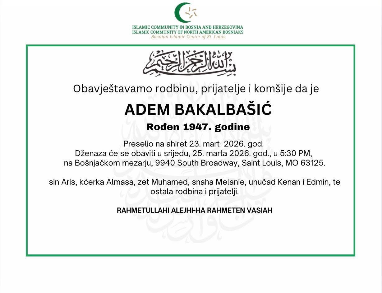 Dženaza će se obaviti u srijedu, 25. marta 2026. godine, u 17:30 sati, na Bošnjačkom mezarju, 9940 South Broadway, Saint Louis, MO 63125.