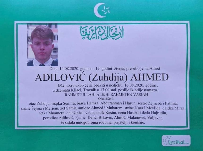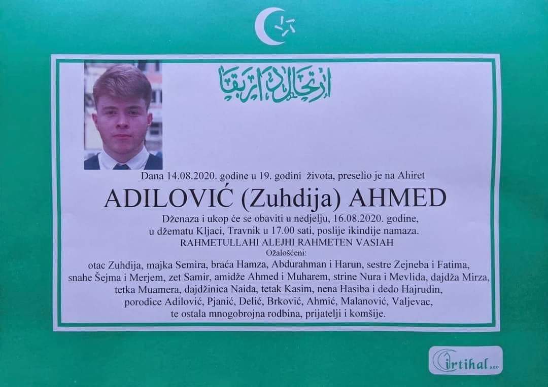 Tužnog srca i s bolom u duši obavještavamo rodbinu, komšije i prijatelje da je naš dragi Adilović (Zuhdija) Ahmed dana 14. augusta 2020. godine, u 19. godini života, preselio na Ahiret.