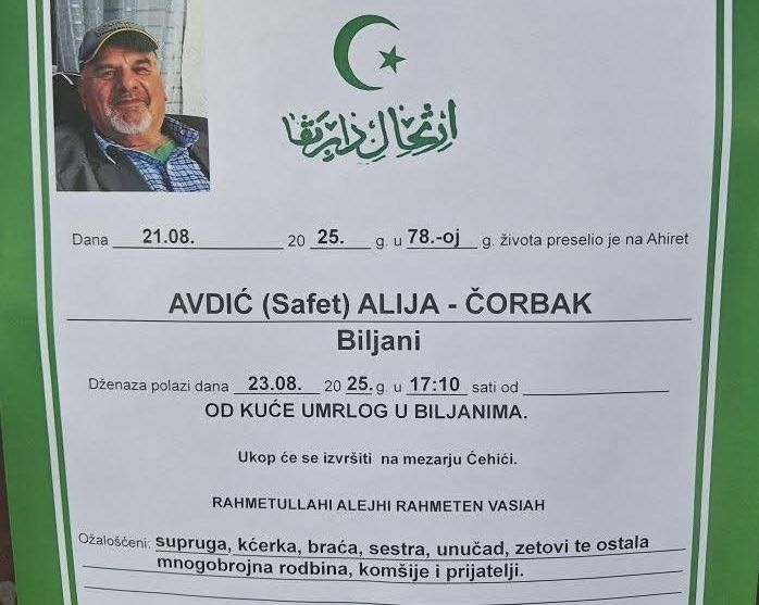Dženaza milog nam rahmetlije polazi ispred kuće umrlog u Biljanima u subotu 23.08.2025. god. u 17:10 sati, a ukop će se obaviti na mezarju Ćehići.