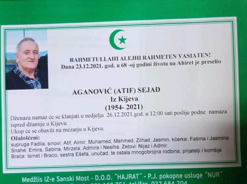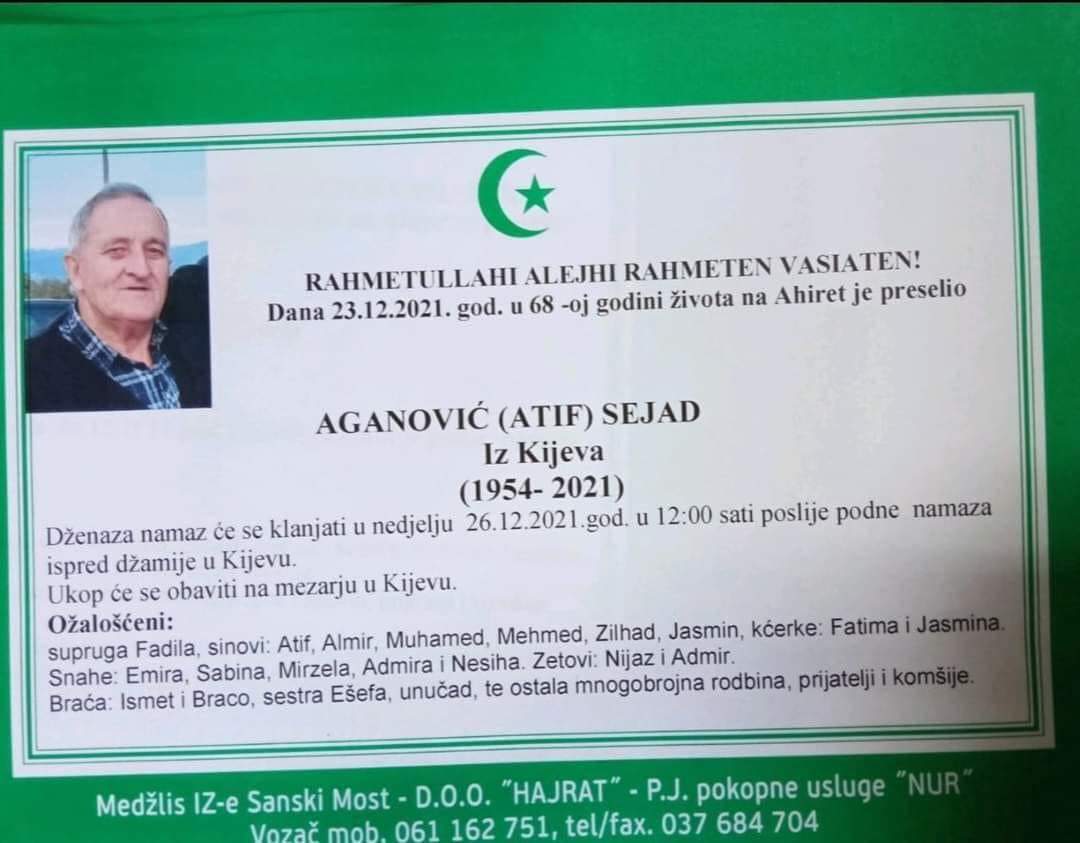 Tužnog srca i s bolom u duši obavještavamo rodbinu, komšije i prijatelje da je naš dragi Aganović (Atif) Sejad dana 23.12.2021. u 68. godini života preselio na ahiret.
