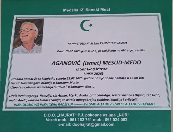 Dženaza namaz će se klanjati u subotu 21.02.2026. godine poslije podne namaza u 12:00 sati ispred Hamzibegove džamije u Sanskom Mostu.