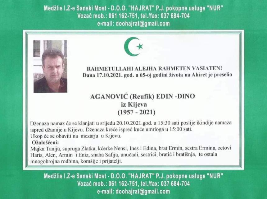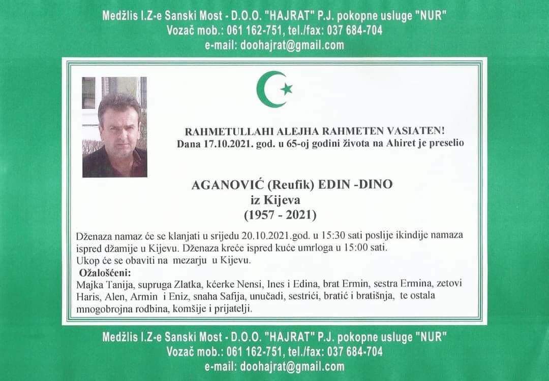Tužnog srca i s bolom u duši obavještavamo rodbinu, komšije i prijatelje da je naš dragi Aganović (Reufik) Edin-Dino dana 17.10.2021. u 65. godini preselio na ahiret.
