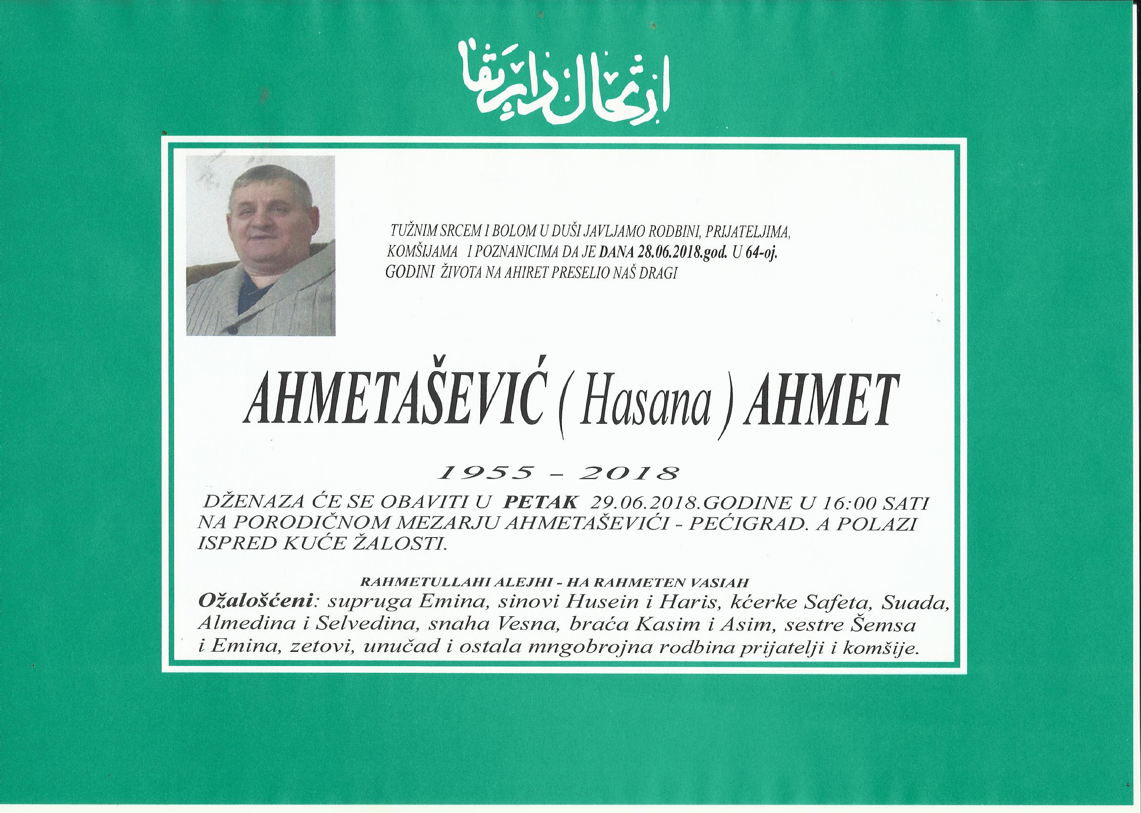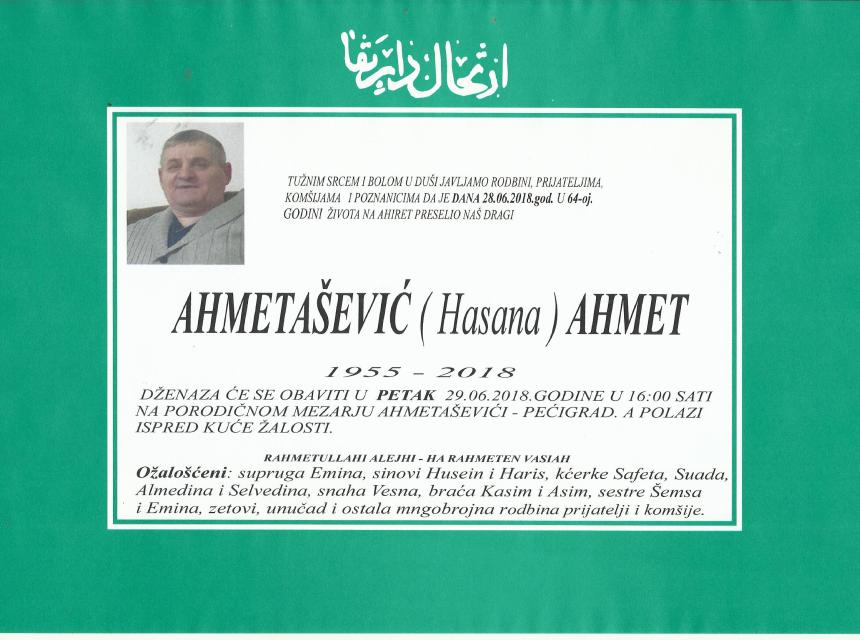 Tužnim srcem i bolom u duši javljamo rodbini, prijateljima, komšijama i poznanicima da je dana 28.06.2018.god. u 64-oj. godini života na ahiret preselio naš dragi Ahmetašević ( Hasana) Ahmet.
