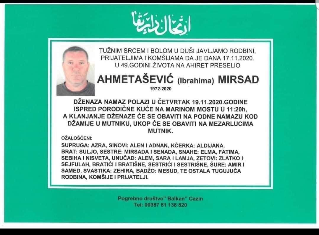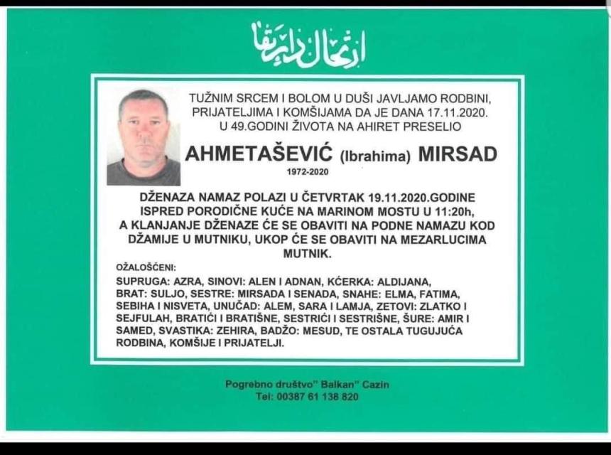 Tužnog srca i s bolom u duši obavještavamo robinu, komšije i prijatelje da je naš dragi Ahmetašević (Ibrahima) Mirsad preselio na Ahiret, dana 17. novembra 2020. godine, u 49. godini života.