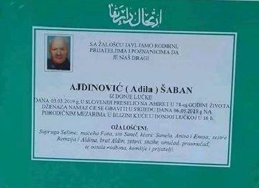 Ožalošćena porodica obaviještava rodbinu, prijatelje i poznanike da je u nedjelju 03. marta u Sloveniji u 71-oj godini života na Ahiret preselio Ajdinović (Adila) Šaban.