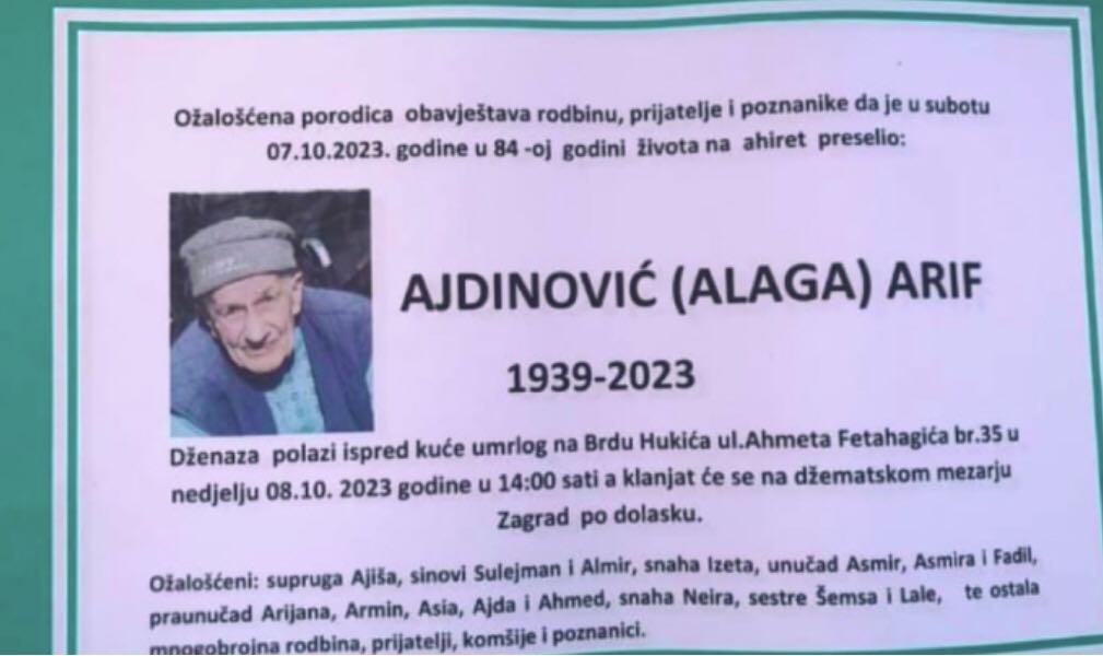 Dženaza polazi ispred kuće umrlog na Brdu Hukića ul. Ahmeta Fetahagića br. 35 u nedjelju 08.10.2023. godine u 14:00 sati a klanjat će se na džematskom mezarju Zagrad po dolasku.
