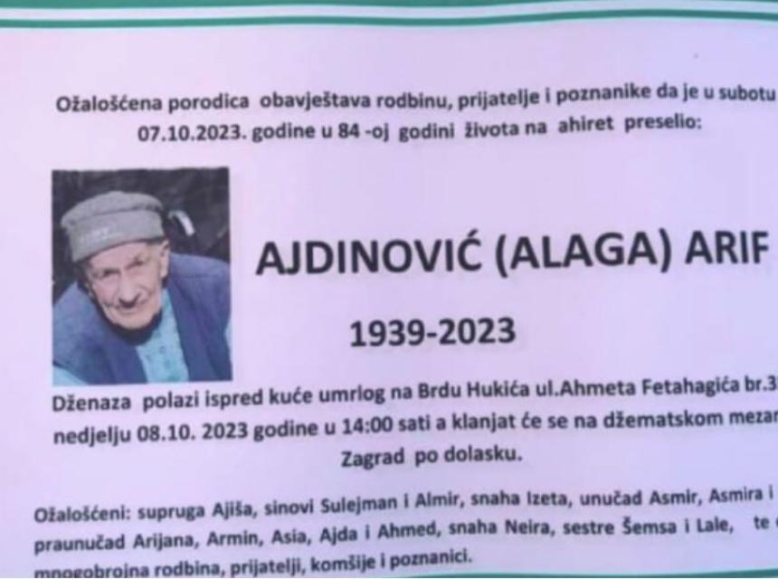 Tužnim srcem i bolom u duši javljamo rodbini, prijateljima i komšijama da je naš dragi Ajdinović (Alaga) Arif, dana 07.10.2023. godine u 84-oj godini života, preselio na Ahiret.