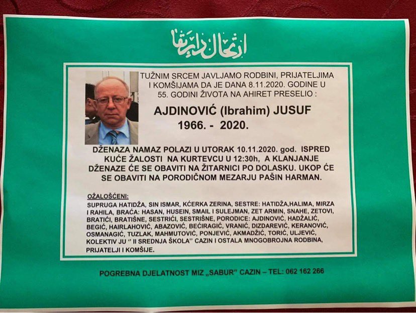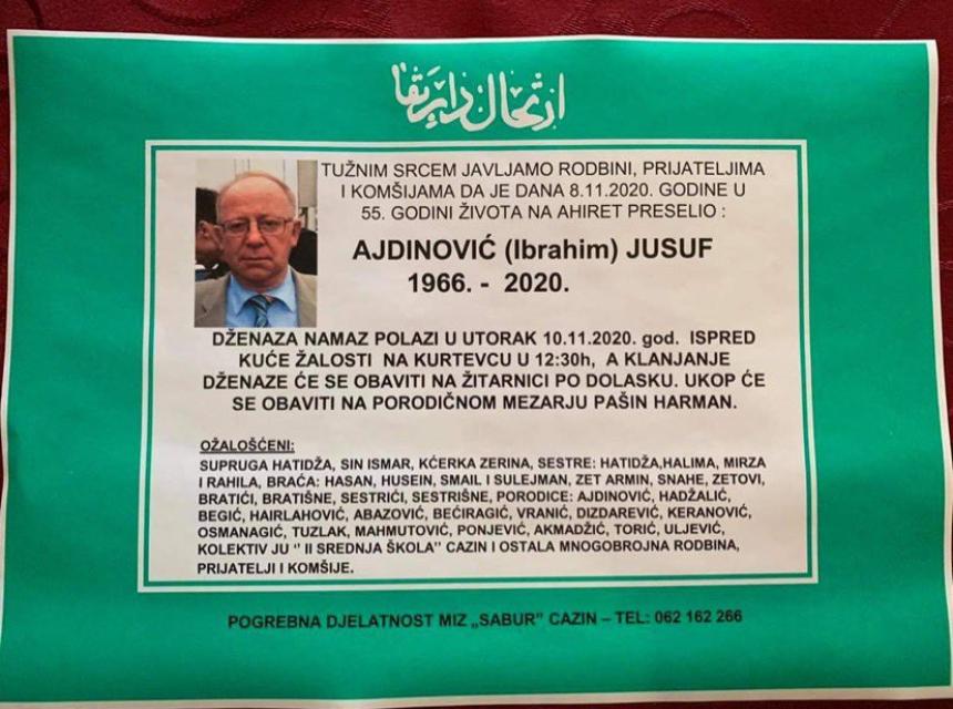 Tužnog srca i s bolom u duši obavještavamo rodbinu, komšije i prijatelje da je naš dragi Ajdinović (Ibrahim) Jusuf 8.novembra 2020. godine, u 55. godini života, preselio na Ahiret.